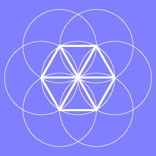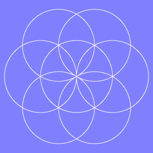 The design above is called the Flower of Life and is constructed with 7 circles of equal size. To make this design draw a circle with a compass, then place the point of the compass on the edge of the circle you drew and draw another circle. Next move the point to one of the intersections of the two circles and draw another circle. Do this at each point a circle crosses the first circle. 6 circles neatly fit around the first.