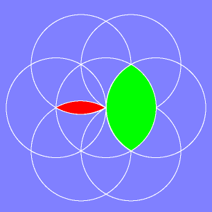 Without connecting the intersections two types of rounded shapes are formed by this design. One is a large leaf shape and the other is a smaller petal shape.